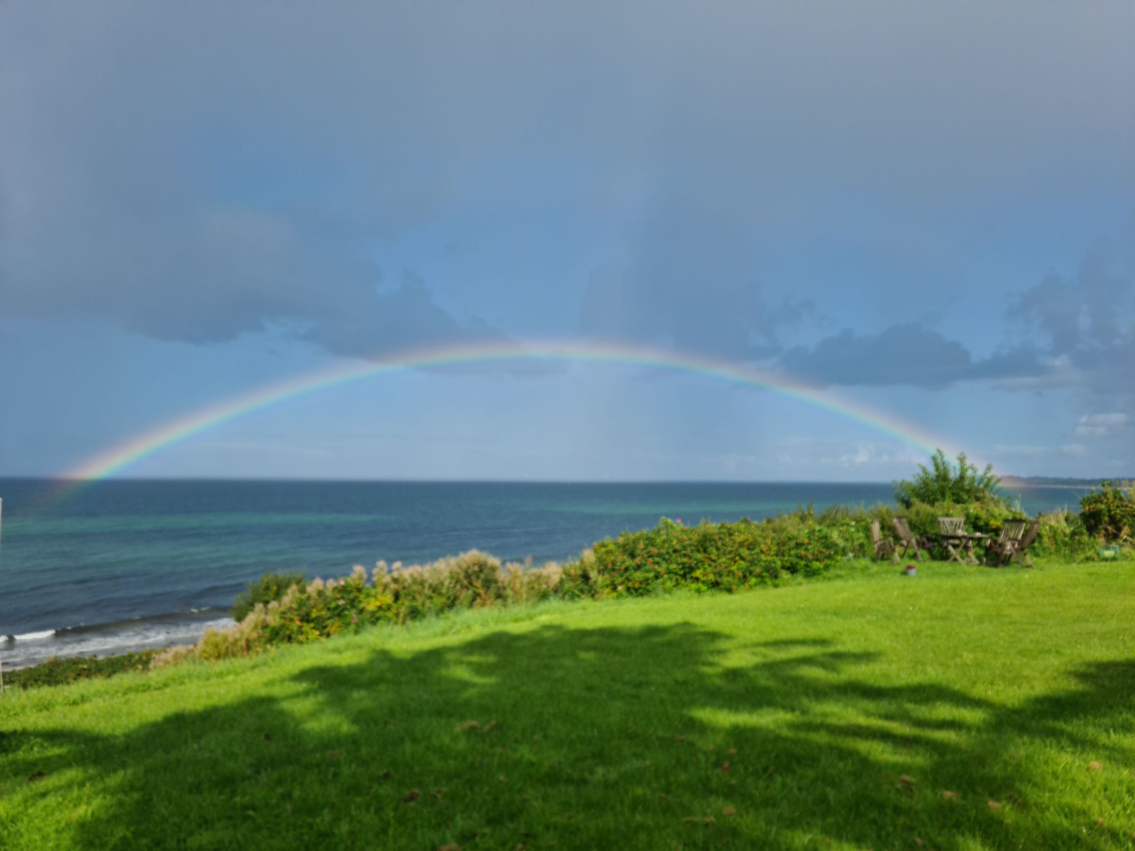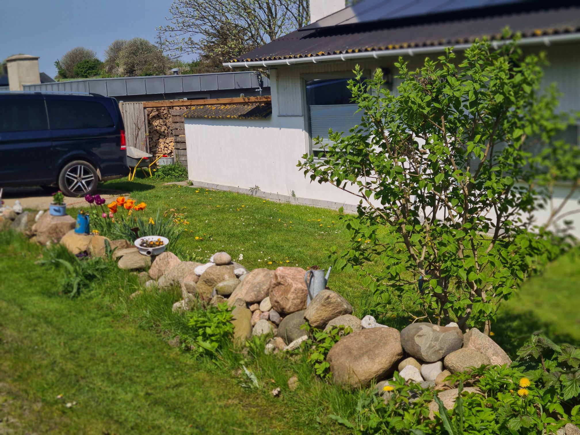 Der Rasen wird von einem Mähroboter gepflegt – wer jedoch Lust hat, darf auch gerne den Rasenmäher aus der Garage nutzen oder Unkraut zupfen.