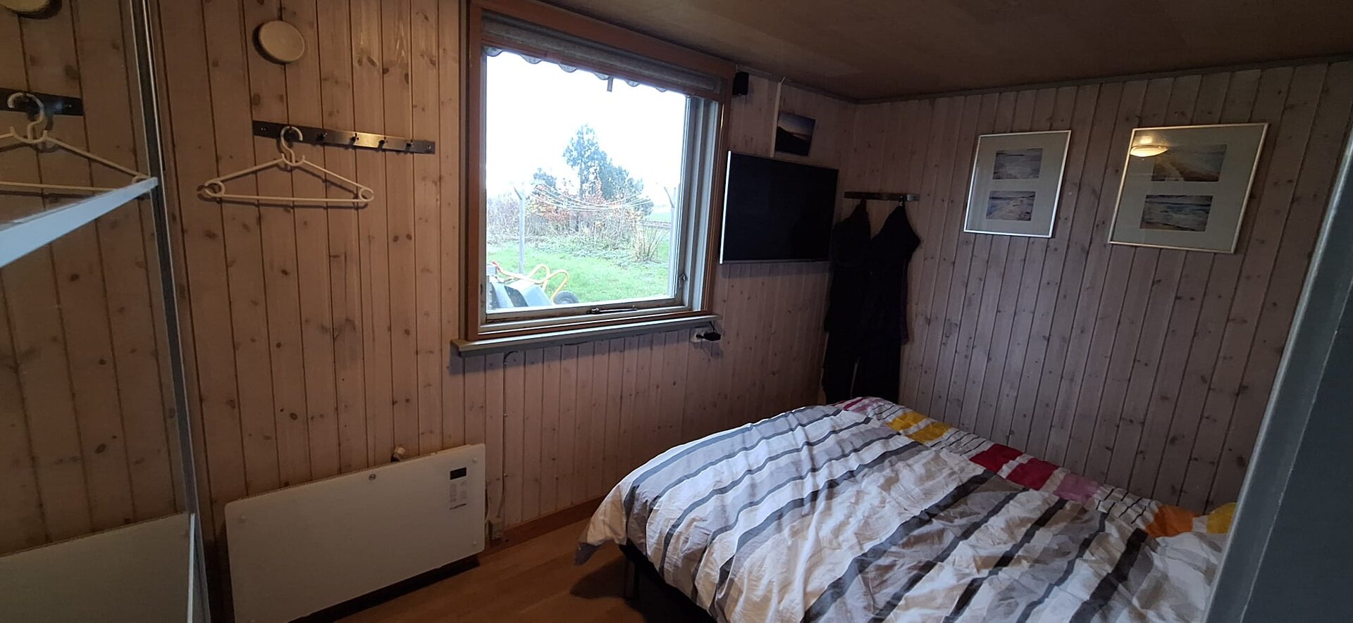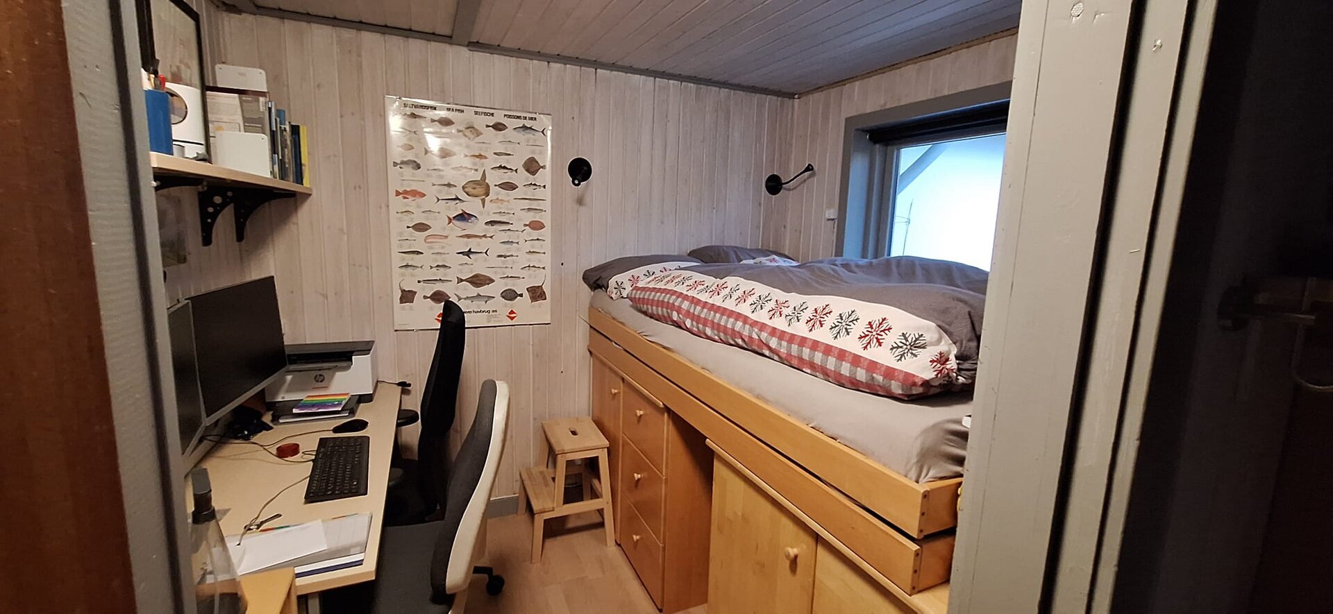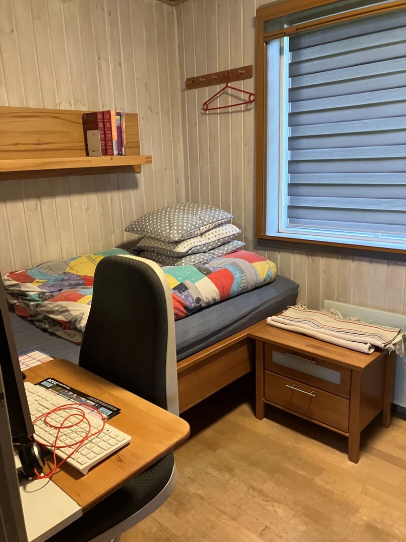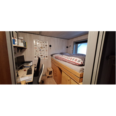- ein Schlafzimmer mit einem 1,20 m breiten Hochbett sowie eigenem Fernseher (Fire-TV-Stick).