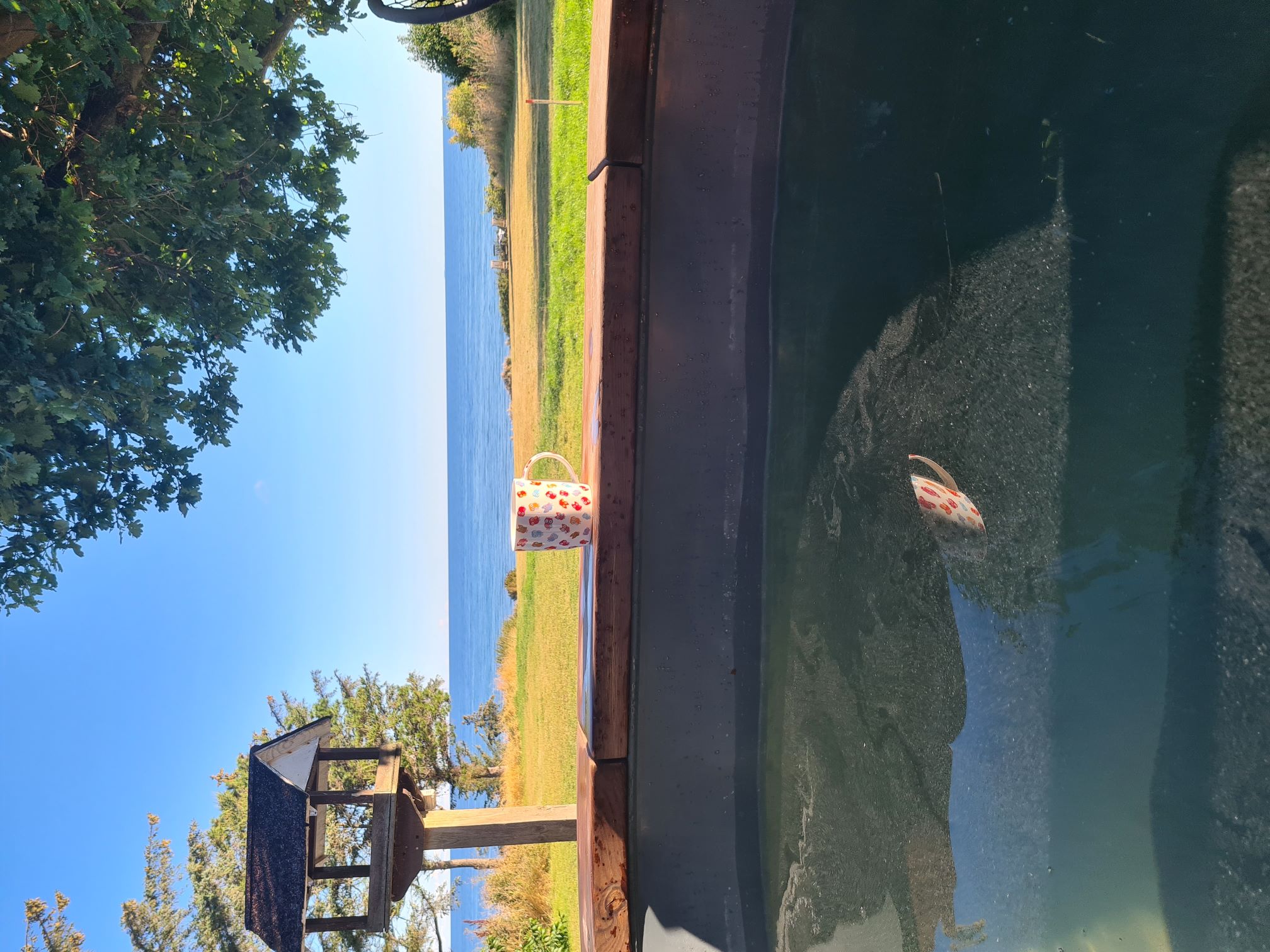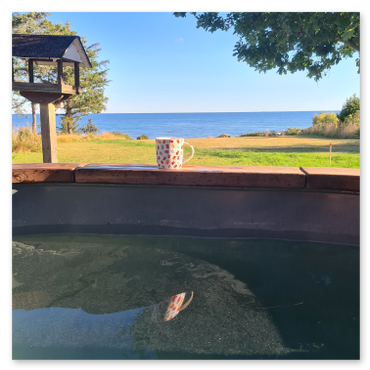 Draußen im Garten unter einer Eiche befindet sich eine geräumige Sauna mit Ruheraum, die bequem über einen Holzsteg erreichbar ist. Außerdem gibt es einen 1.000-Liter-Hot-Tub, der mit Holz beheizt wird. Am Ende des Grundstücks liegen drei Kajaks, die mitbenutzt werden dürfen. Das Tragen von Rettungswesten ist Pflicht und die Nutzung ist nur bei schönem Wetter erlaubt.