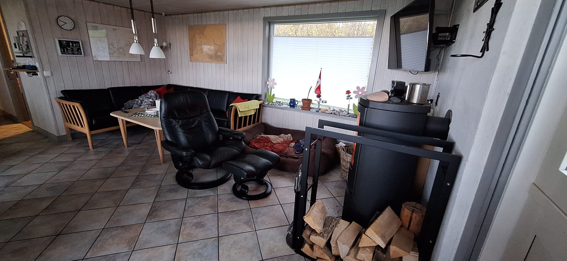 Für gemütliche Abende steht ein Holzofen zur Verfügung, alternativ sorgt eine Wärmepumpe für wohlige Wärme.