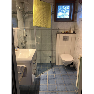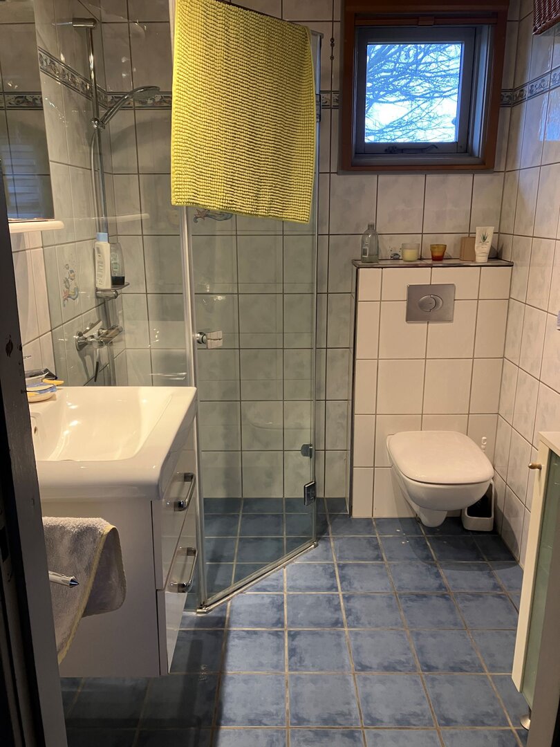 Das Badezimmer ist mit Wand-WC und Dusche ausgestattet.